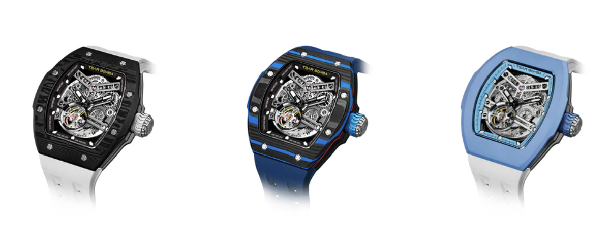 Ce qui frappe au premier regard, c’est le boîtier tonneau si caractéristique de la collection phare TB8204. Avec ses arêtes acérées, ses vis apparentes et ses matériaux innovants, carbone forgé, acier inoxydable 316L, PVD noir ou or rose, la marque joue la carte du design technique inspiré de l’automobile et de l’aéronautique. Chaque montre semble sortie d’un cockpit de F1 ou d’un chasseur de cinquième génération.