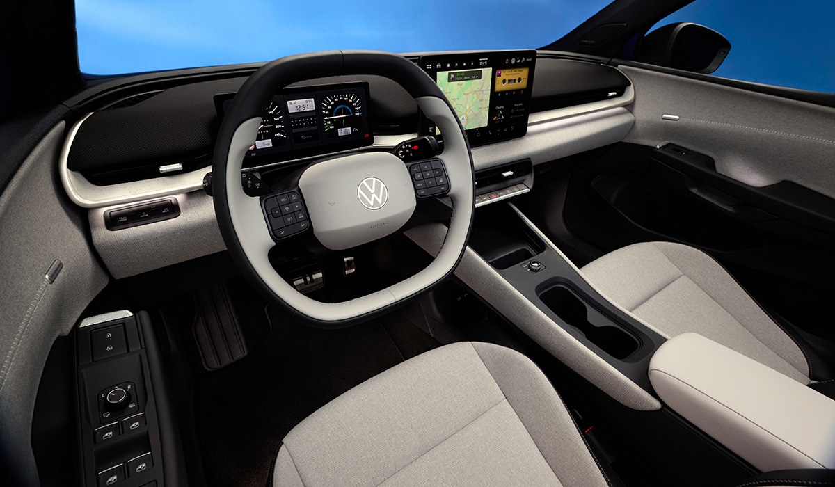 Cette ID.Polo bénéficie d’un habitacle un peu moins minimaliste que celui de l’ID.3, qui avait lancé la gamme électrique du constructeur allemand. On trouve des commandes physiques, plus pratiques que le tout numérique, ainsi qu’une console centrale flottante, dotée de deux porte-gobelets. On dispose, pour l’instrumentation, d’une tablette numérique de 10,25 pouces qui, si on le souhaite, peut recourir à un design évoquant celui de la toute première Golf.